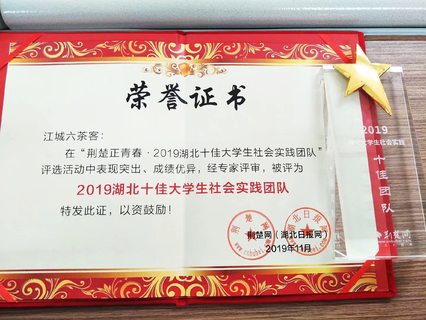 11月9日,由荆楚网(湖北日报网)主办的“荆楚正青春•2019湖北十佳大学生社会实践团队”颁奖仪式举行,我院“江城六茶客”团队荣获“2019湖北十佳大学生社会实践团队”称号。