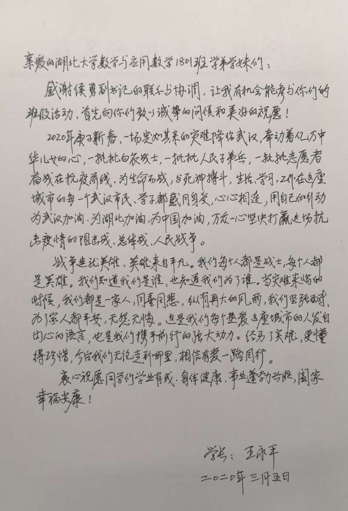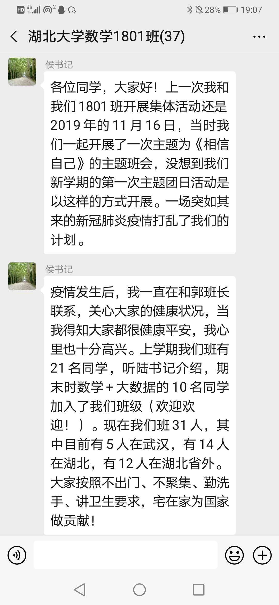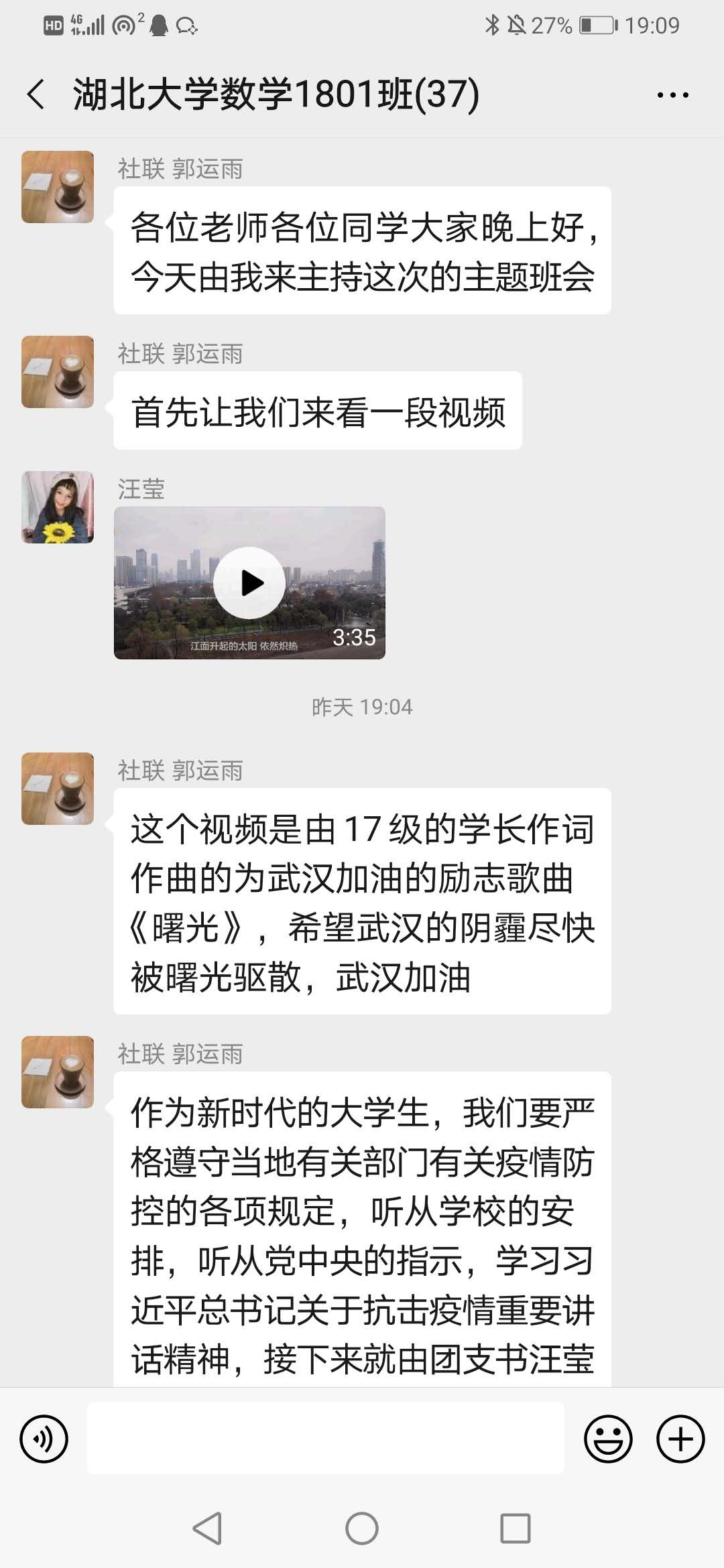“别问我是谁,别问我为谁,我们都是一家人,同喜同悲。不管有多苦,不说有多累,风雨一定会过去坚强面对。”这是校党委副书记侯勇将现任湖北省文联副主席的王永平校友作词的全国抗疫优秀公益歌曲《知道我为谁》带入到主题团日活动中,用于激励学生们携手共进,共抗疫情。3月5日晚,侯勇参加了yl23411集团数学与应用数学1801班召开的以“开展云团日,厚植爱国心”为主题的团日活动。yl23411集团党委书记万路路、院长曾祥勇出席活动,院党委副书记、班主任、辅导员也全程参与了活动。