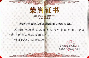 5月15日,武汉市武昌区紫阳街残疾人联合会对2021年度志愿服务工作进行了表彰,我院暖阳志愿服务队因在2021年助残志愿服务工作中的突出表现,被评为“最佳助残志愿服务团队”,这也是暖阳志愿服务队连续第5年获得该项荣誉。