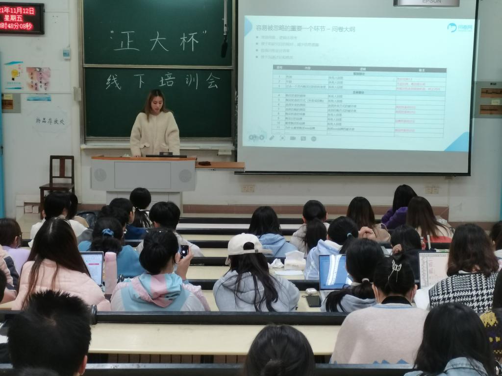 2021年11月12日晚18:30,我院组织开展了“正大杯”第十二届全国市场调查与分析大赛赛前指导工作,上海众言网络科技有限公司的拓丽霞、王童文指导专家团队在yL23411永利集团四号教学楼309对参加本次正大杯比赛的同学进行了以“调研与分析那些事儿”为主题的赛前培训。