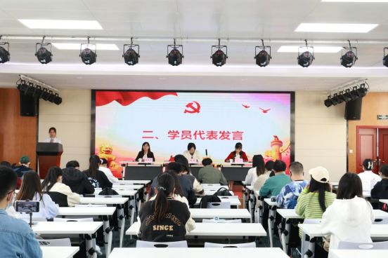 2021级应用统计学团支部赵梦婷同学作为学员代表发言,她对学校、学院党校为同学们提供这么好的学习平台表示感谢,并结合自身的入党动机、对党的认识和学习实际,向同学们发出三点倡议:一是要勤学,下得苦功夫,求得真学问。二是要修德,提升自我素质,加强党性修养。三是要笃实,扎扎实实干事,勤勤恳恳做人。