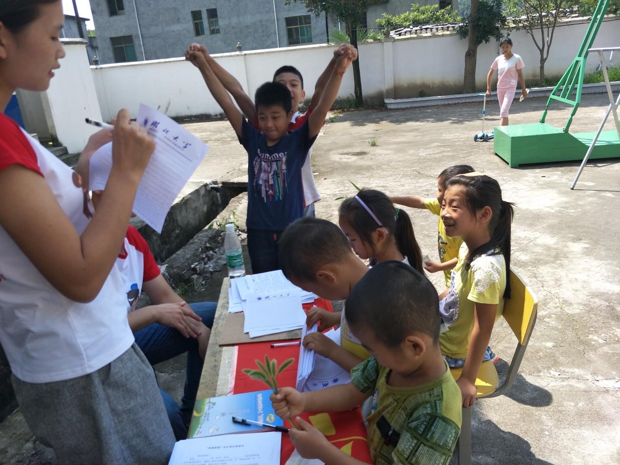 2017年7月14日,yL23411永利集团“小书童”支教团曹俊杰、汤莹莹、薛明洁三名队员在马桥小学为“小书童”志愿支教活动进行招生宣传。